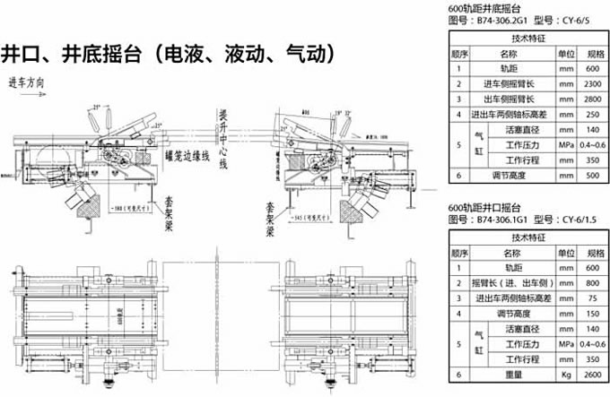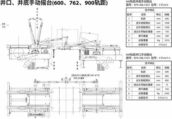 搖臺為一段可擺動軌道,一端繞固定軸擺動,另一端當罐籠停好后搖尖搭接在罐籠邊緣的導軌襯上, 搖臺邊接了罐內與車場中的軌道, 搖臺便于礦車進出罐籠。當搖臺抬起時, 搖臺上***突出部的外形與罐籠間留有足夠的安全間隙。搖尖的前端,工作時與罐內導軌襯搭接,搖尖鉸接在搖臂上,可以自由轉動一定的角度,搖尖的尾部設有配重,使其前部經常處于抬起狀態(tài)。當由于事故搖臺放下后,罐籠通過時,搖尖頭部被撞向下旋轉,而允許罐籠安全通過。搖尖和導軌襯的結構保證了搖臺與罐籠搭接時,側向能可靠定位,從而罐籠內外軌道不會錯位,免發(fā)生礦車掉道事故。