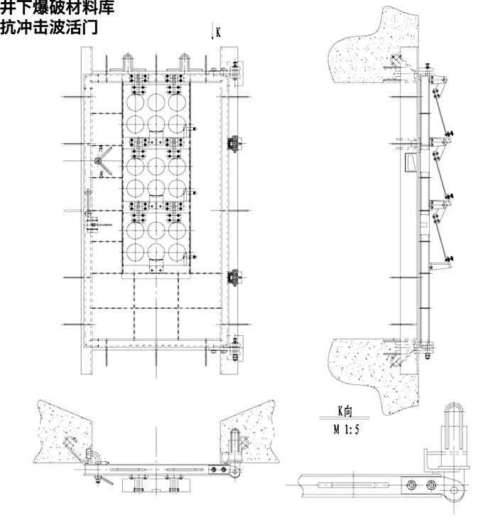 6、炸藥庫抗沖擊波活門向庫內(nèi)開啟,本設(shè)計(jì)采用向右側(cè)開啟,若需要向左側(cè)開啟,則應(yīng)以門扇中線為對稱軸,對稱變更各零件位置。